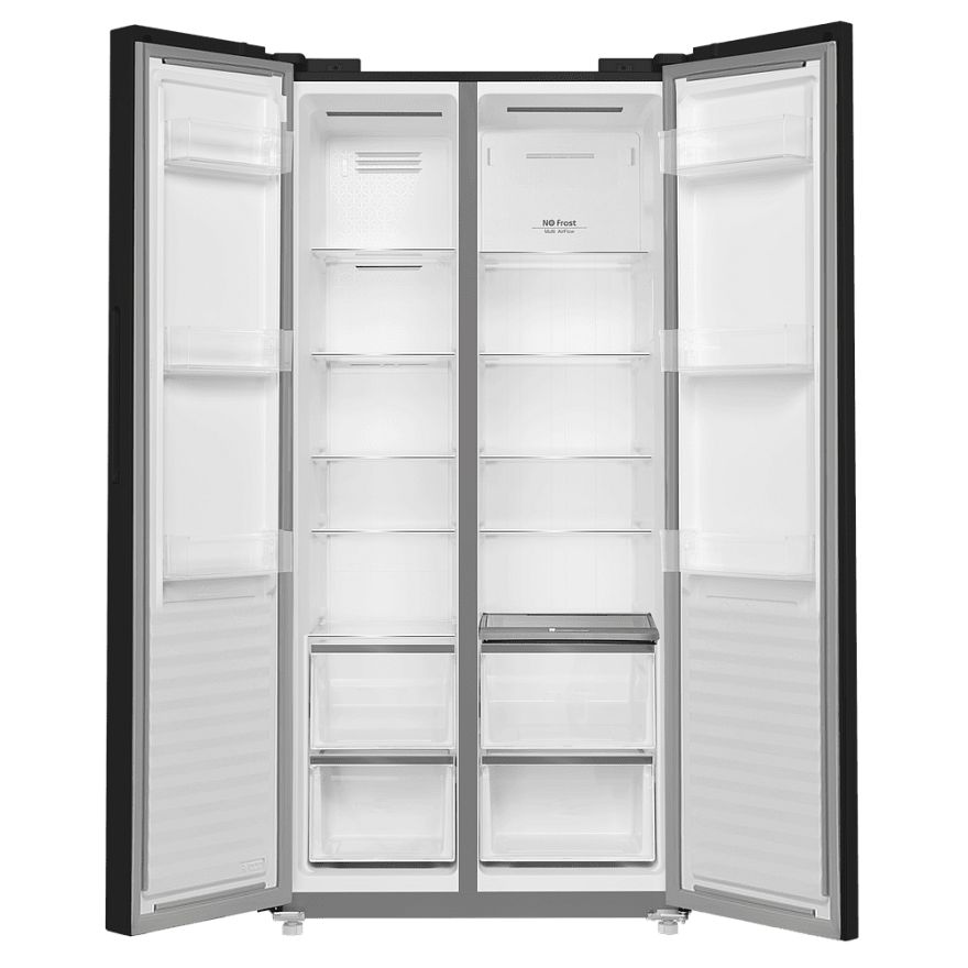 В холодильном отделении предусмотрено 4 полки из закаленного стекла и 2 ящика для овощей и фруктов. На двери расположено 5 полок и лоток для яиц. Морозильное отделение оборудовано 6 ящиками и емкостью для льда. Мощность замораживания составляет 11 кг за 24 часа.